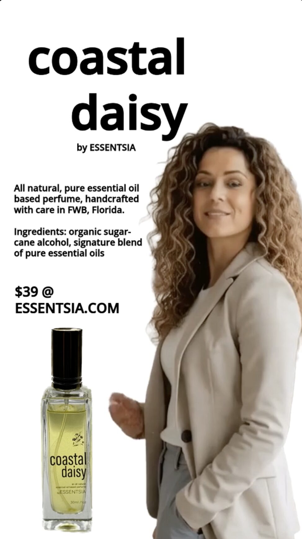 "Every ESSENTSIA scent is handcrafted using only organic sugar cane alcohol and 100% pure essential oils – nothing synthetic, nothing unnecessary. The result is clean, expressive fragrance that wears naturally on the skin and advances with you throughout the day. Thoughtfully blended, locally made in Fort Walton Beach, Florida, USA, and designed for everyday confidence, ESSENTSIA is fragrance in its purest form."