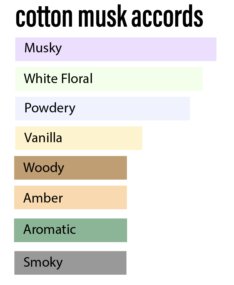 Comforting and alluring. Cotton Musk’s clean, soft, and warm fragrance accords make it versatile for daytime and evening wear.